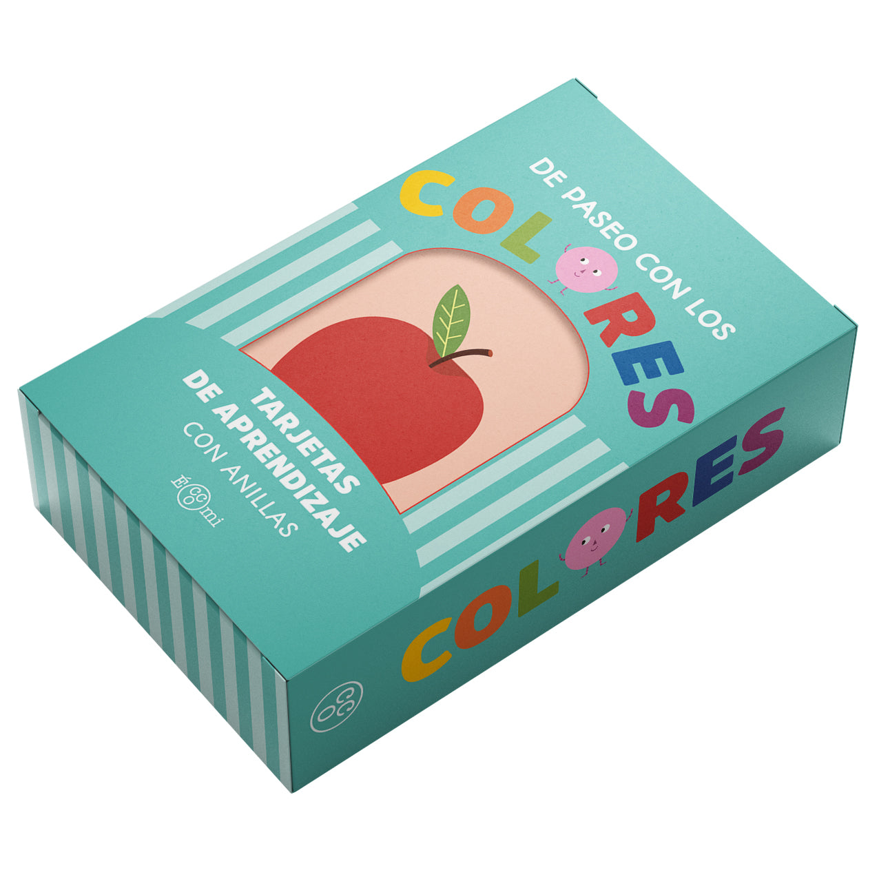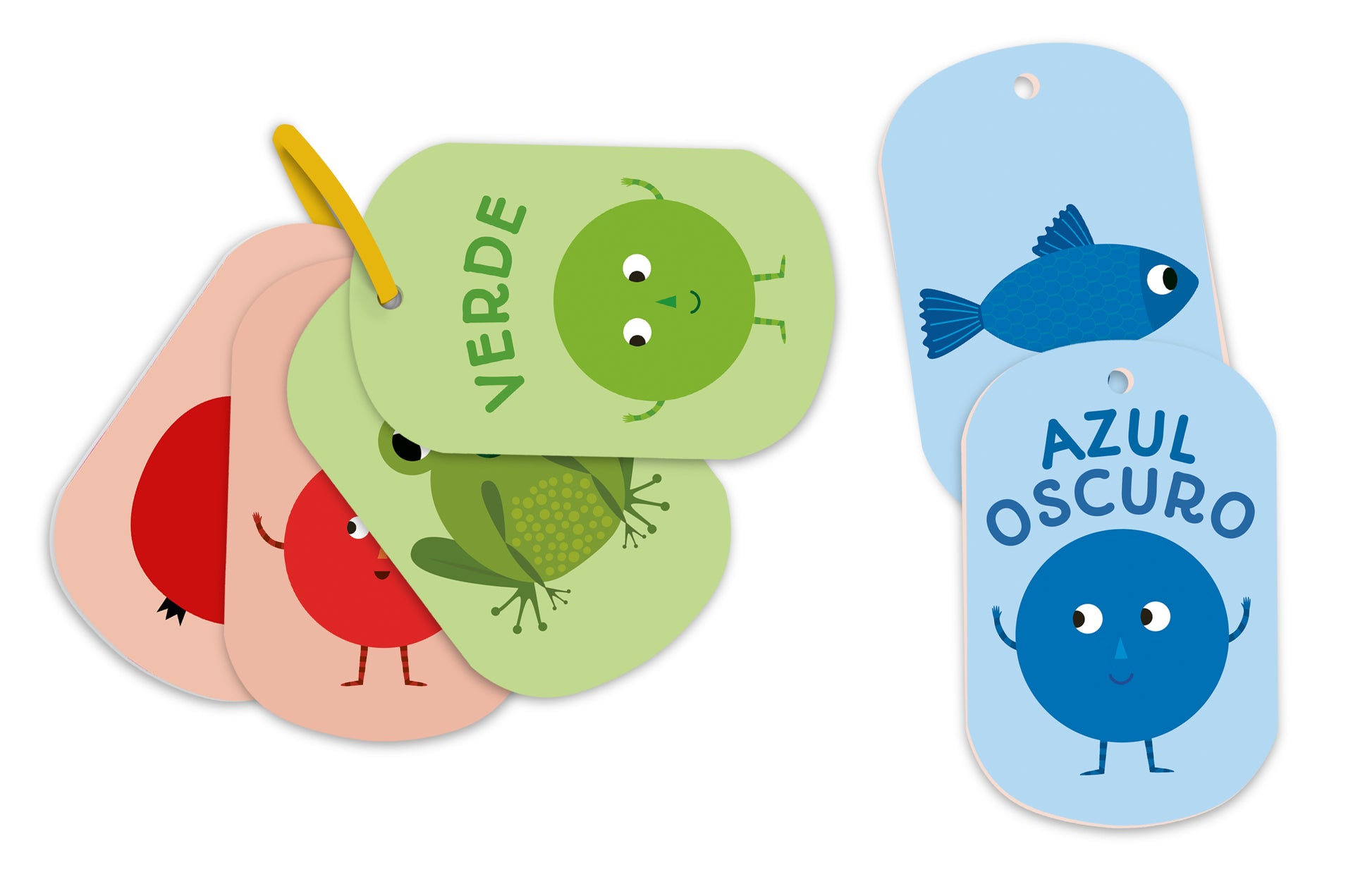 Esta caja contiene 12 tarjetas resistentes, diseñadas para mirar, tocar y aprender. En una cara, un simpático personaje representa cada color; en la otra, un objeto cotidiano lo acompaña.